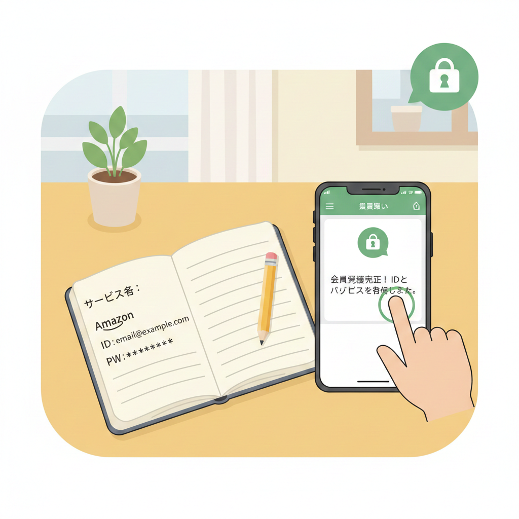 - アナログ派: 専用のノートを作り、サービス名・ID・パスワードを書き留めます。